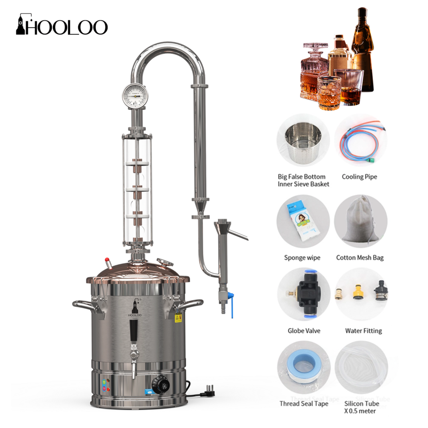 Destilador HOOLOO CT20Cu, adecuado para uso doméstico y talleres pequeños, estructura de torre de vidrio única, destilación multicapa. La calefacción eléctrica autónoma se controla mediante una perilla, cristal de cobre puro, destilación completa, equipo de elaboración de cerveza exquisito. Se puede utilizar para ginebra. producción de whisky, brandy, vodka, ron e hidrosol y aceites esenciales.