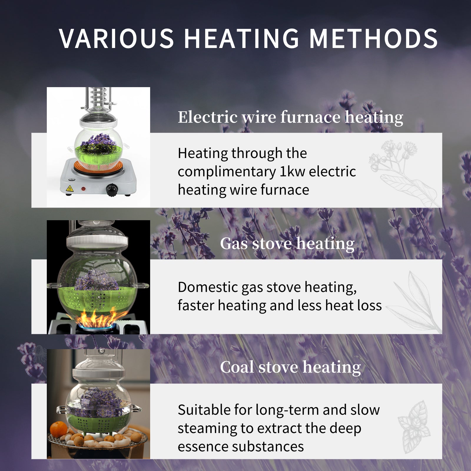 Fácil de usar: proporcionamos una estufa de alambre eléctrico de 1 KW para calentar la olla. La fuente de calor también puede ser una estufa de gas, una estufa de cerámica, leña, etc. (diferentes métodos de calentamiento y diferentes destilados, el tiempo de extracción pura es diferente)