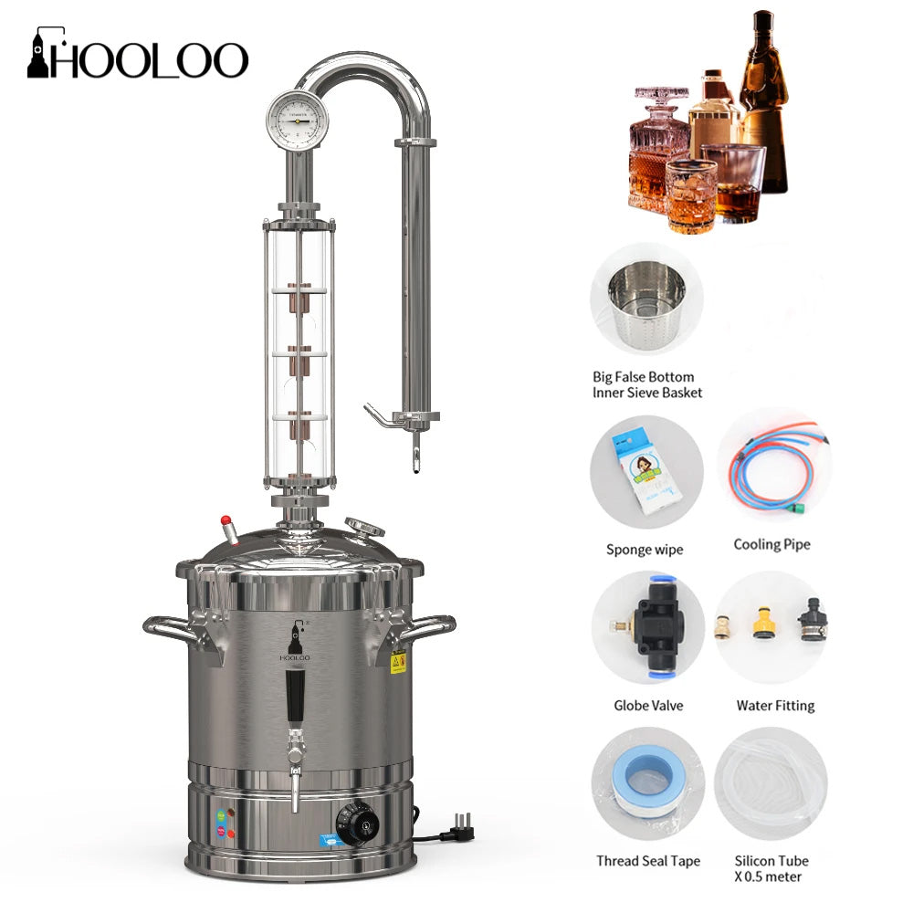 HOOLOO CT20s Distiller,suitable for home use and small workshops, unique glass tower structure, multi-layer distillation.Self-contained electric heating is controlled by a knob,Pure Copper Crystal,Complete Distillation,Exquisite Brewing Equipment.can be used for gin, whiskey, brandy, vodka, rum and hydrosol and essential oil production.