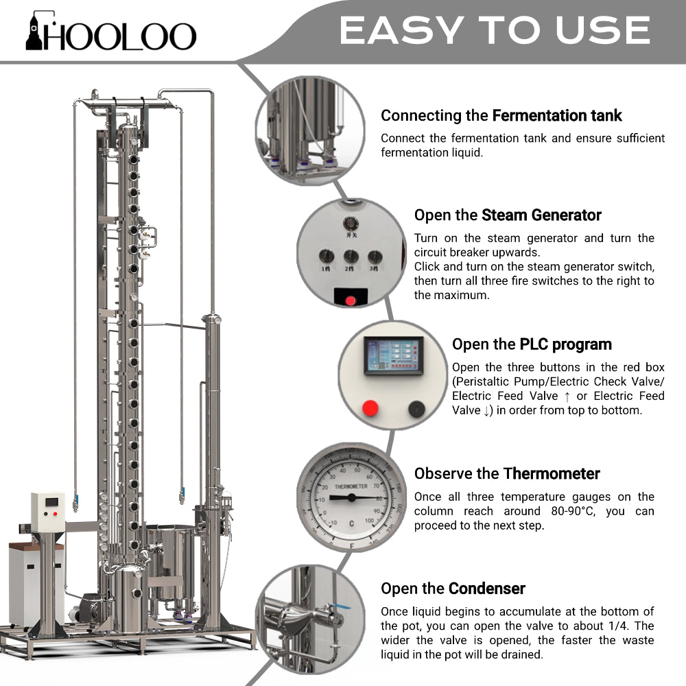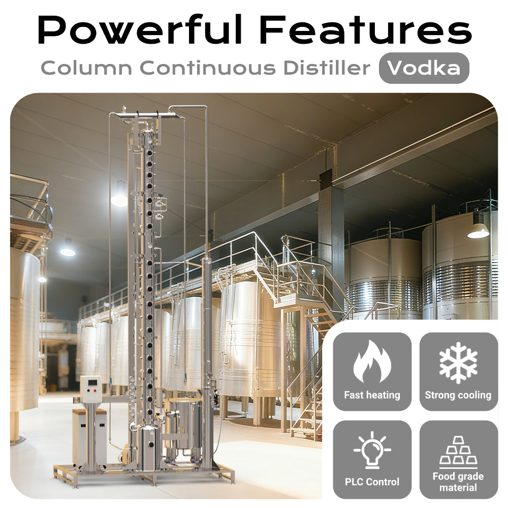 Featuring an PLC control, this continuous distillation equipment allows real-time temperature monitoring at key positions. It integrates control switches for various pumps and valves, supports auto/manual modes, and includes CIP cleaning and multi-column control functions, enabling intelligent distillation process management for enhanced efficiency and quality.
